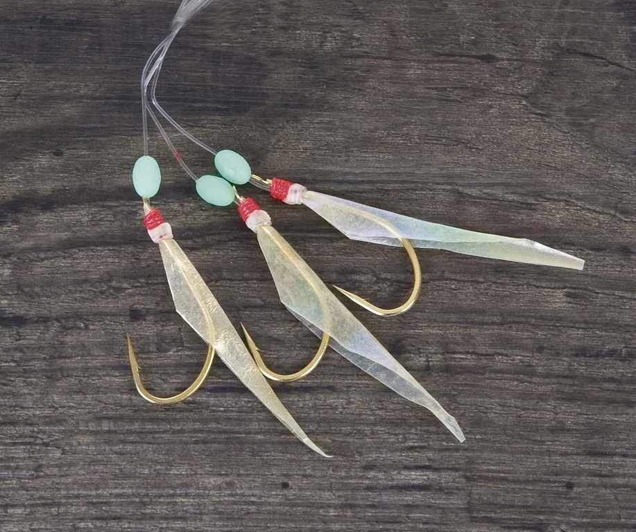 mit drei Haken der Größe 6/0, das Vorfach hat bei einer Länge von 1,40m eine Stärke von 0,90mm