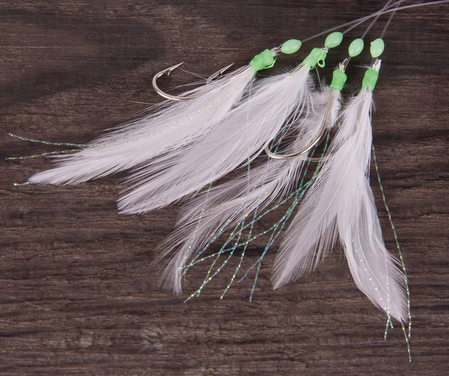 Dieses Makrelenvorfach ist mit 4 O’Shaughnessy Haken, Fluoperlen, Federn und Marabou ausgestattet.