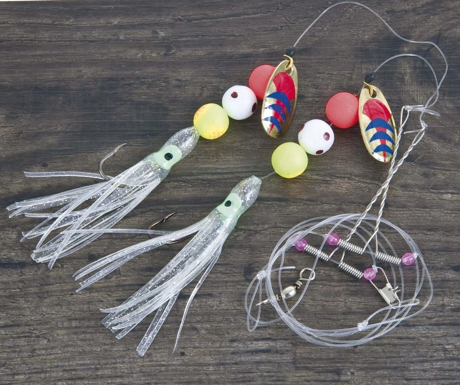 Typisches Plattfischvorfach mit hoher Lockwirkung durch verschieden farbige Perlen und Locklöffel. Ausgestattet mit Black Nickel Baitholder Hooks und je einem Fluo-Octopus.