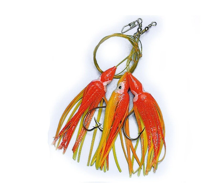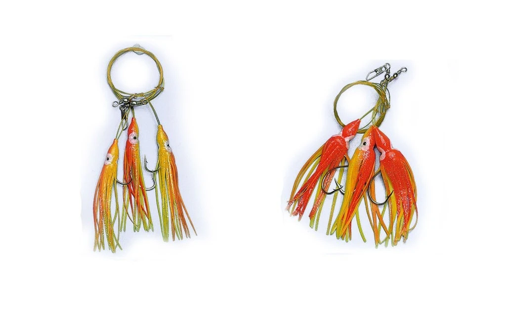 Dieses Vorfach gibt es in zwei verschiedenen Versionen mit Haken der Größe 6/0 oder 7/0. Die Gesamtlänge beträgt 1,45m und die verwendete monofile Schnur hat einen Durchmesser von 0,70mm. Die gelb-orangen Octopusse haben eine Länge von 12cm.