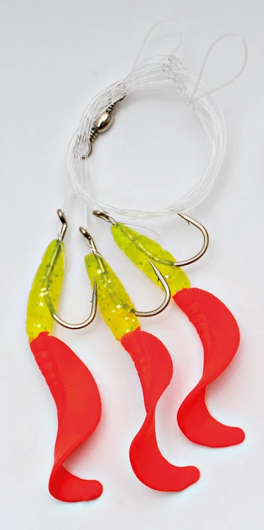 Dieses Rig bestehtr aus 3 Twistern in der Farbe Chartreuse-Japanrot. Diese sind an einem Haken der Größe 4/0 befestigt. Das Vorfach hat bei einer Länge von 1,15m eine Stärke von 0,70mm.
