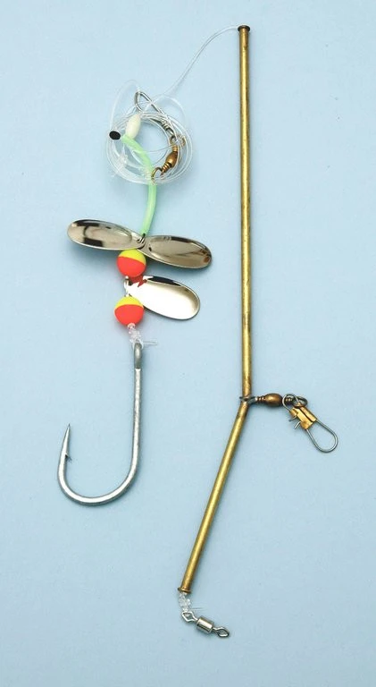 Das Naturködervorfach besteht aus einem Metallboom als Durchlaufmontage, drei Spinnerblättern, Leuchtschlauch und Lockperlen. An der 1mm starken Schnur ist eine Einzelhaken angebracht. Die Gesamtlänge beträgt 1,30m.