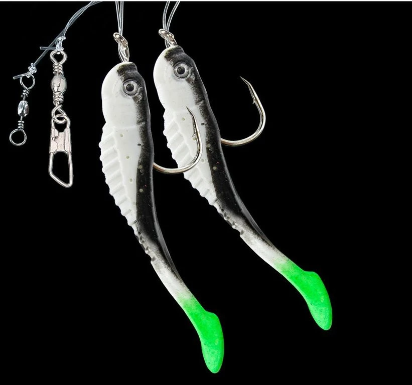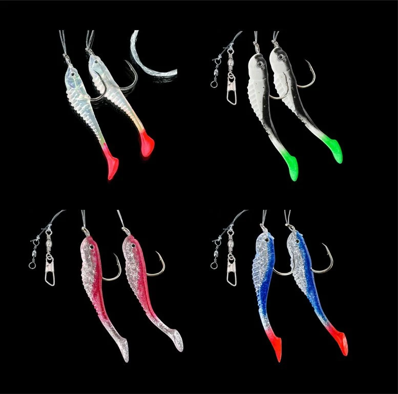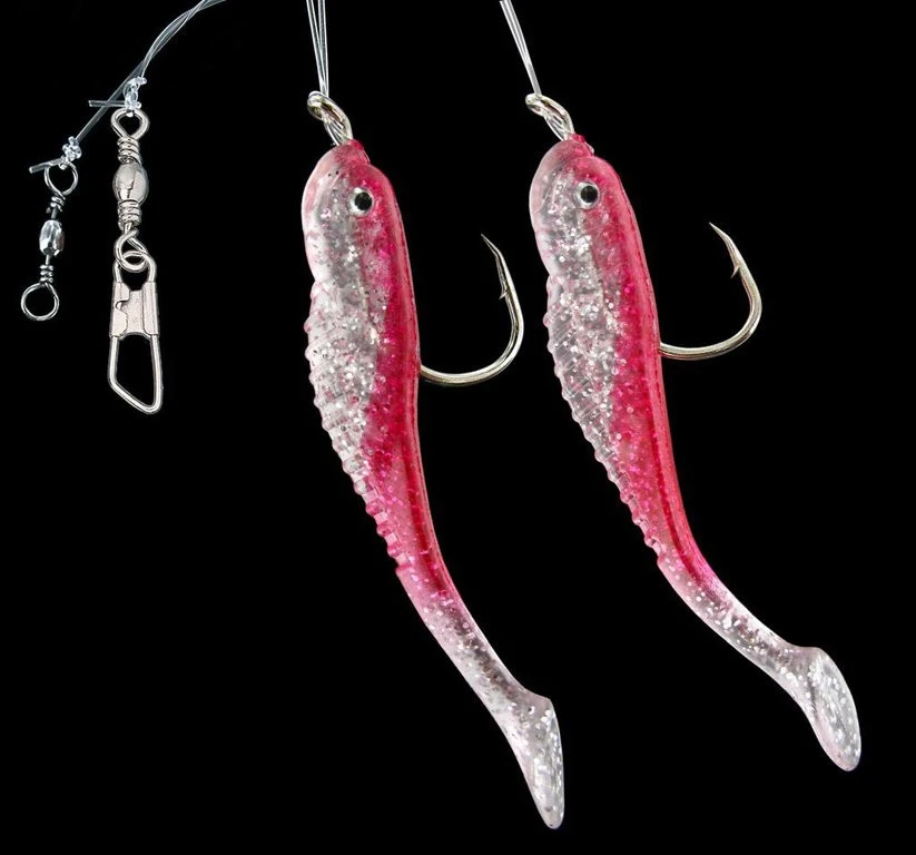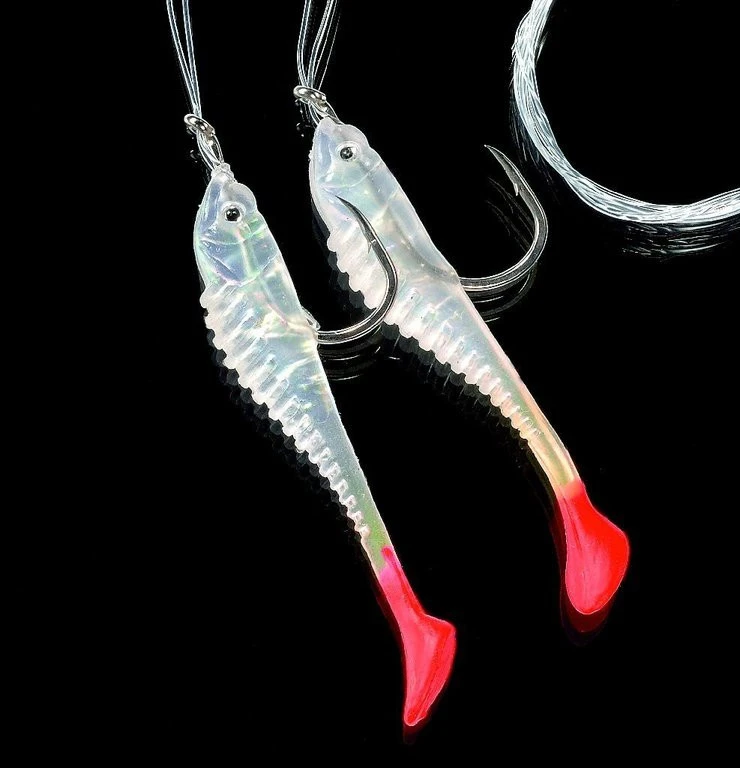 Dieses Vorfach besteht aus zwei soften Gummifischen mit Paddelschwanz und inneliegender Reflexfolie. Die Fische sind an 0,60mm starker monofiler Schnur und Haken der Größe 4/0 befestigt.