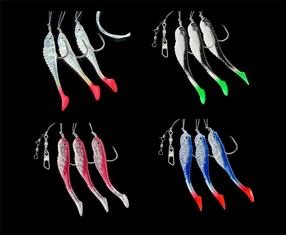 Dieses Vorfach besteht aus drei soften Gummifischen mit Paddelschwanz und inneliegender Reflexfolie. Die Fische sind an 0,80mm starker monofiler Schnur und Haken der Größe 7/0 befestigt.