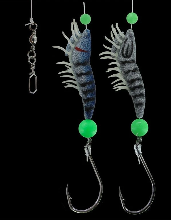Dieses sehr fängige Vorfach ist ideal für Norwegen. Es besteht aus zwei Seitenarmen mit einer Schnurstärke von 0,80mm, die an einer 1,00mm starken Hauptschnur befestigt sind. An den Seitenarmen sind UV-Shrimp-Imitate befestigt, welche an einem Haken der Größe 8/0 montiert sind. Das Vorfach ist 140cm lang und wird in zwei Farbvarianten angeboten.