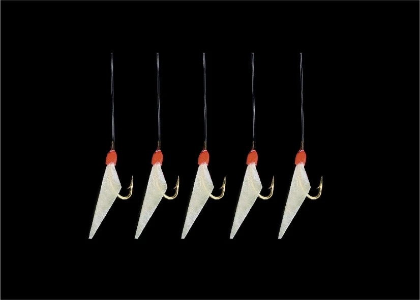 Dieses Heringsvorfach besteht aus 5 Seitenarmen mit Haken der Größe 12, die mit Fischhaut versehen sind. Die Schnur hat eine Stärke 0,35/0,30mm.