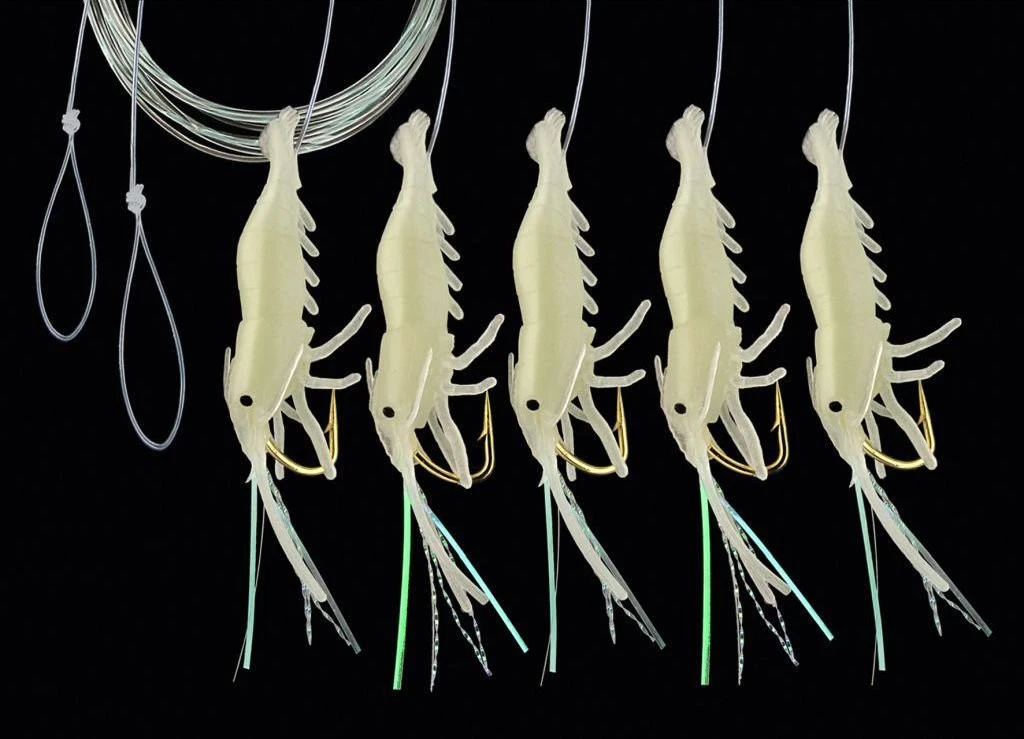 Dies ist ein sehr fängiges Vorfach mit 5 Seitenarmen. Es ist mit attraktiven Shrimp-Imitaten versehen und perfekt montiert bzw. geknotet. Es hat eine Länge von 150cm, eine Schnurstärke von 0,50mm und eine Hakengröße von 1/0. Es gibt zwei verschiedene Farben.
