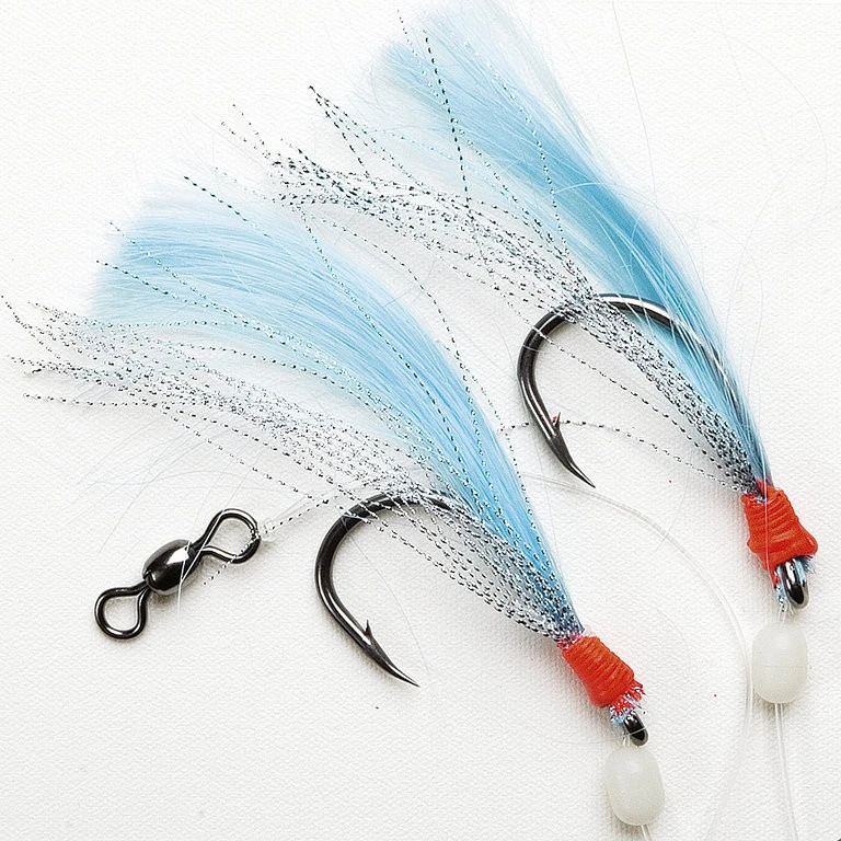 Dieses Federn-Vorfach gibt es in Pink oder Blau. Die zwei Haken der Größe 8/0 sind an einer 0,80mm starken monofilen Schnur montiert. Somit ist dieses Rig ideal für große Dorsche oder Seelachse geeignet.