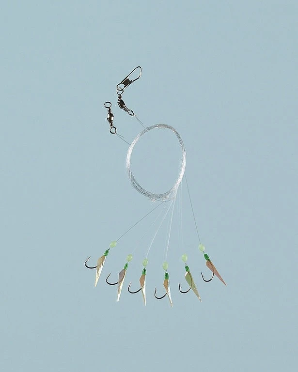 Dieses Herings-Rig besteht aus einer 0,40mm starken Hauptschnur an der sechs Seitenarme mit jeweils einem Haken montiert sind. Die silbernen Haken sind mit einem Fischhautimitat versehen und das Kopfende ist Fluo-Farbe versehen. Das Vorfach gibt es in der Hakengröße 8 und 6.