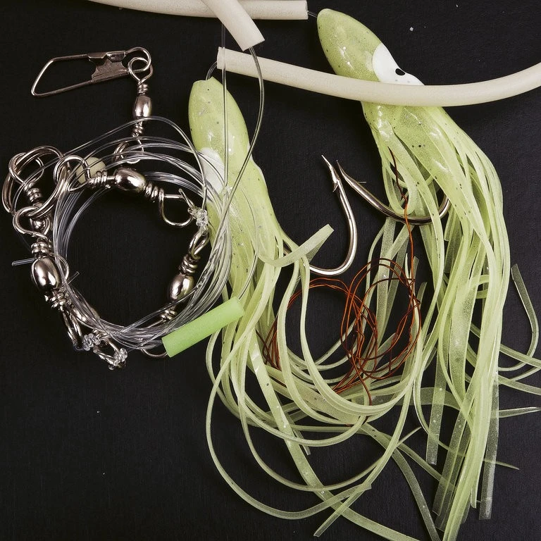 Dieses System ist ideal für den Fang von Leng, Lumb und Heilbutt. Es besteht aus zwei Seitenarmen, an denen sich jeweils ein Einzelhaken der Größe 10/0 befindet. Am Haken befindet sich auch noch eine Fluo-Oktopus und die Seitenarme werden durch einen Fluo-Schlauch, gegen scharfe Zähne geschütz. Zudem erhöhen sie die Reizwirkung des Systems. An den Haken befindet sich zusätzlich noch ein Kupferdraht, mit dem der Naturköder fixiert werden kann. Für dieses System wurden extra starke Wirbel benutzt. Der obere Seitenarm ist an einem Wirbel befestigt, der wiederum an einem sehr stabilen geschmiedeten Ring hängt.