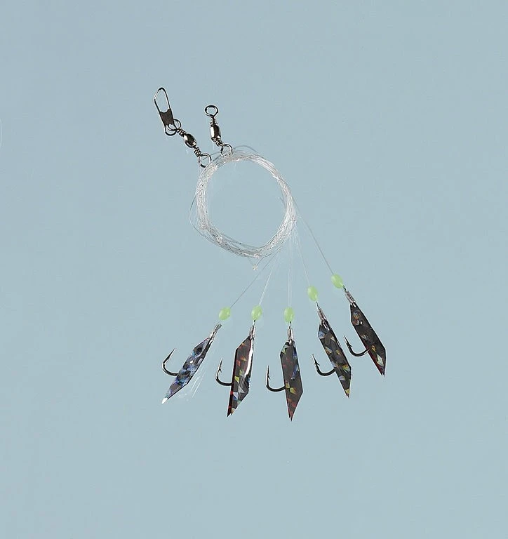 Dieses Herings- und Makrelensystem besteht aus 5 Haken der Größe 6 bzw. 3/0. Diese sind mit silberroter Holofolie verziert. Die Hauptschnur des Rigs mit Hakengröße 6 beträgt 0,40mm und dient dem Fang von Heringen, während das Vorfach mit Hakengröße 3/0 dem Fang von Makrelen dient und eine 0,60mm starke Hauptschnur besitzt.