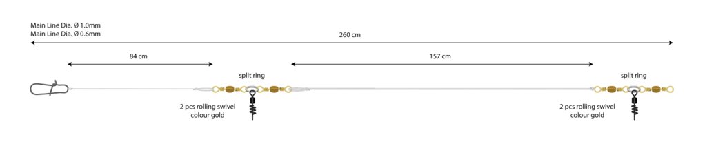 Das Basissystem, dass mit verschiedenen Ködern frei verwendet werden kann. Es hat eine 1,00 mm dicke Hauptschnur und eine Abrießstelle mit 0,6 mm Durchmesser. Das Vorfach ist 2,60cm lang und damit geeignet für Tiefen bis 300m. Kombiniert wird es mit Naturköder-Systemen. Gemacht ist das Grundvorfach für das Lumb-, Leng-, Heilbutt- und Dorschangeln.