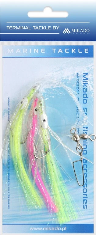 Dieses Vorfach besteht aus drei weißen Oktopussen mit einer Größe von 7,5cm und Federn in den Farben Chartreuse und Pink. Die verwendete Hakengröße ist 2/0, was das Rig ideal für Dorsch, Makrele und Seelachs macht.