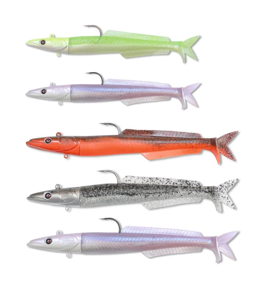 Dieses tolle Sandaal-Imitation Set besteht aus fünf Ködern in vier verschiedenen Farben und zwei Größen. Sandaale zählen zur Hauptbeute vieler Meeresfische und verfehlen ihre Wirkung nur selten. Geliefert mit einem Kopf mit zwei Schwänzen je Packung. Im Set sind 2x 12g und 3x 20g Köder, jeweils mit Ersatzschwanz.
