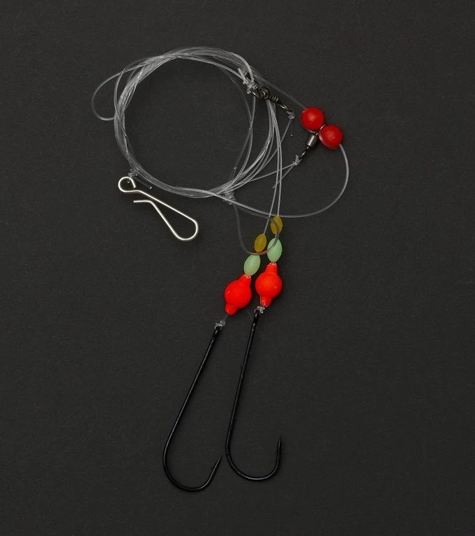 Dieses Plattfischvorfach hat eine Länge von 75cm und besteht aus einer 0,55mm starken monofilen Hauptschnur und einer 0,35mm Mundschnur. Die Hakengröße beträgt 2/0.