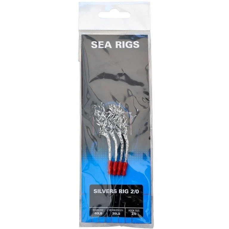 Dieses traditionelle Meeresvorfach für Seelachs und Makrele besteht aus vier Haken der Größe 2/0. Die Haken haben einen roten Kopf und silberne Büschel.