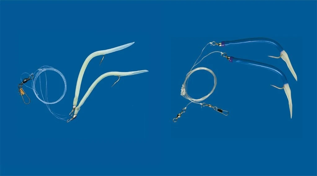 Dieses Vorfach besteht aus zwei Gummi-Makks, die an einer starken 0,80mm monofilen Schnur befestigt sind. Es gibt dieses Rig mit fluofarbenen und blau-fluo Makks in den Größen 4/0, 6/0 und 8/0.
