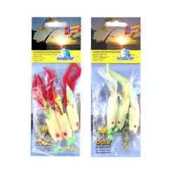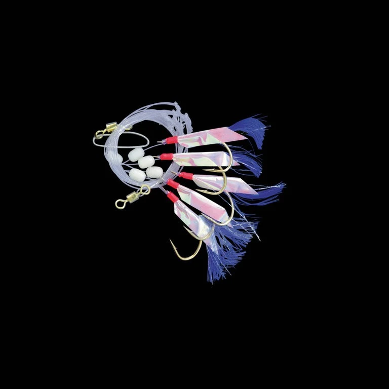 Diese Dorschfliege besitzt dunkelblaue Franzen, Perlen und Goldhaken. Das Vorfach ist in drei verschiedenen Hakengrößen von 3/0, 5/0 und 7/0 verfügbar. Es ist 170cm lang und besteht aus 0,80mm starker monofilen Schnur.