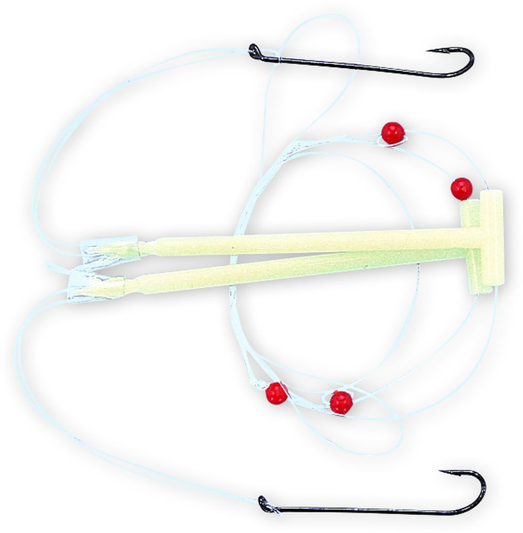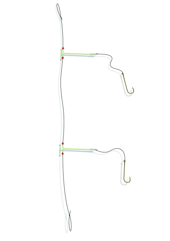 Dieses Buttsystem besteht aus zwei Seitenarmen mit Butthaken der Größe 2. Die Hauptschnur hat einen Durchmesser von 0,60mm und die Mundschnüre 0,40mm. Das gesamte Vorfach hat eine Länge von 100cm.