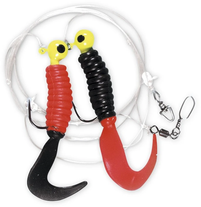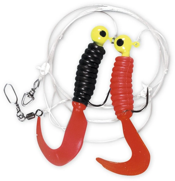 Dieses Vorfach besteht aus zwei Twistern mit einer Größe von 7,5cm. Das Vorfach besteht aus roten und schwarzen Twistern, welche in drei verschiedenen Farbkombinationen verfügbar sind. Die Hauptschnur hat eine Stärke von 0,70mm und die der Seitenarme von 0,65mm. Die Hakengröße ist je nach Modell 1/0 oder 3/0. Die Jigs haben eine Größe von 7,5cm.